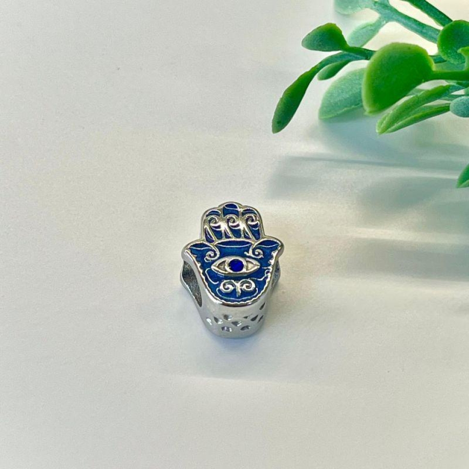 Berloque Separador Mão de Fátima Azul: símbolo de proteção, boas energias e espiritualidade. Feito em aço inox, traz um toque de cor e significado à sua pulseira, conectando estilo e fé em um único acessório especial.